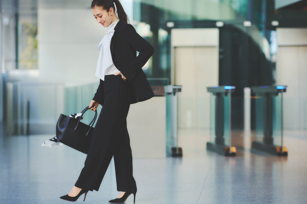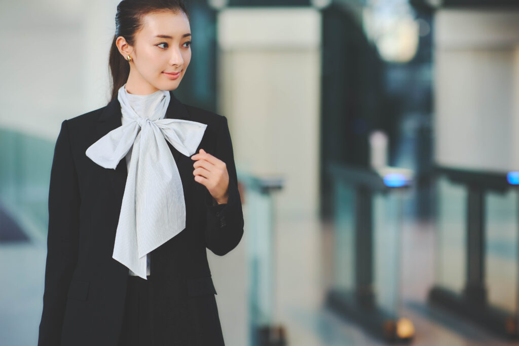 オフィスの服装ルールに関わらず、取引先への挨拶にはセットアップなどきちんと見えするコーデで向かうのがマナー。とはいえ、新入社員とは差のつくこなれ感も欲しいから、インナーは着映え力のあるボウタイブラウスで。立体感のあるデザインが大人の瑞々しさを引き立ててくれます。ジャケット¥52,800パンツ¥31,900(ともにTheory)ブラウス¥18,700(ユナイテッドアローズ/ユナイテッドアローズ 渋谷スクランブルスクエア店)バッグ¥64,900(ヴァジック/ヴァジックジャパン)バッグにつけたスカーフ¥15,400(マニプリ)パンプス¥17,050(ダイアナ/ダイアナ 銀座本店)イヤリング¥176,000(ウノアエレ/ウノアエレ ジャパン)