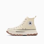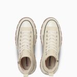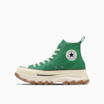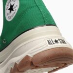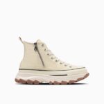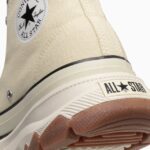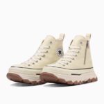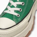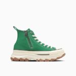 トレッキングシューズをモチーフにした、ボリュームのあるアウトソールを合体したデザインが目を引く“TREKWAVE”。厚みのあるE.V.A.ミッドソールや防滑性を意識した意匠のアウトソールはクッション性や防滑性が向上されています。サイドジッパー仕様の「ALL STAR Ⓡ TREKWANE Z HI」は、コーディネートのアクセントになるグリーンとどんな装いにもマッチしてくれるバターホワイトの2カラー展開です。