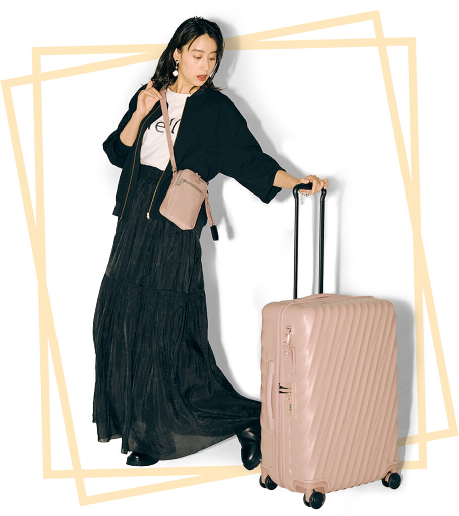 食べ歩きに美容ツアー、ショッピングに推し活とやることづくしの韓国旅行は、大容量キャリーケースと、手ぶらになれてパスポートもすっぽり入るクロスボディバッグが必要不可欠。大人っぽいマットなモーヴピンクなら、スタイリッシュなモノトーンコーデの邪魔をせず、ほどよい華やぎを添えてくれます。マチ幅を拡張するとたっぷり80ℓも入るサイズでも軽やかな操作性は健在で、軽量なのもうれしいポイント。