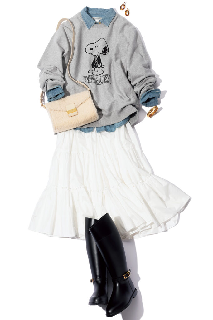 スウェット¥23,100(ブルックス ブラザーズ© 2024 Peanuts Worldwide LLC/ブルックス ブラザーズ ジャパン)ダンガリーシャツ¥28,600(アウター ノウン/サザビーリーグ)スカート¥30,000(シーニュ)バッグ¥169,400ブーツ¥89,100(ともにセルジオ ロッシ/セルジオ ロッシ カスタマーサービス)ピアス¥5,940バングル¥19,950(ともにアビステ)