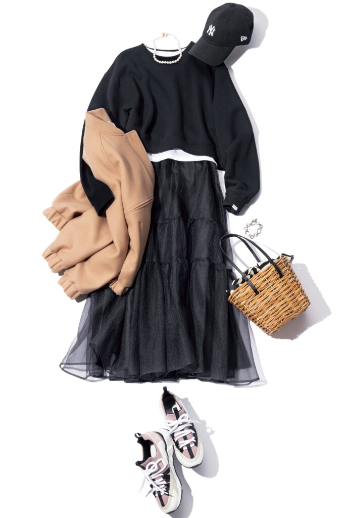 スポーティ×甘スカートのテイストミックスは、黒でまとめて大人っぽさを意識。ショート丈のスウェットはボリュームボトムスと合わせてももたつかず、バランスよくスタイルアップできる旬アイテム。白Tを衿と裾から見せて、全体の重量感の調整を。
