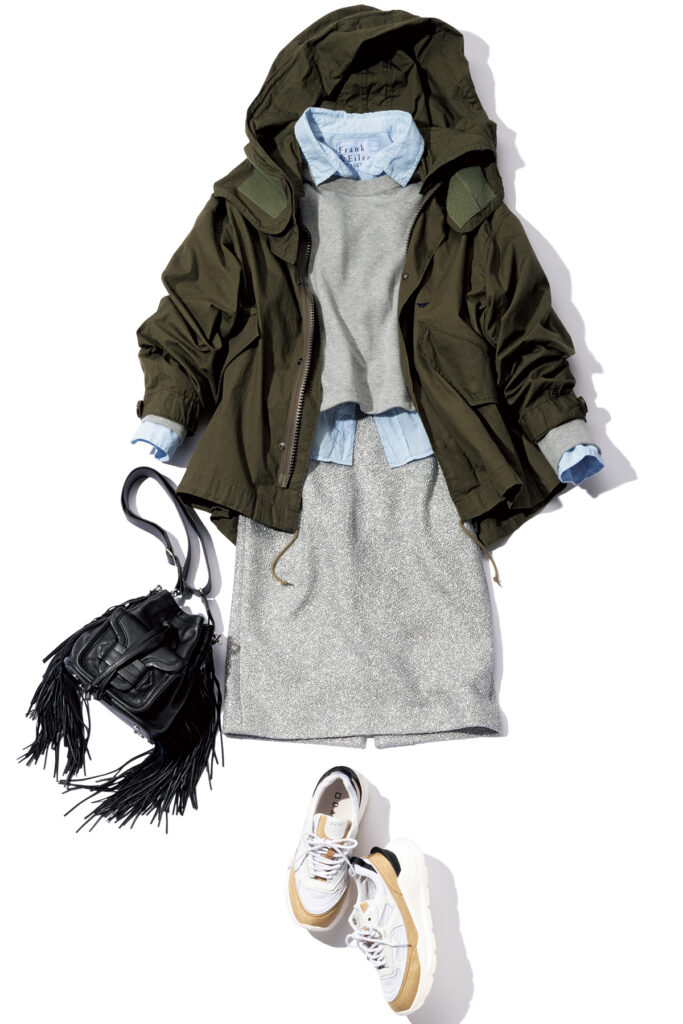 ブルゾン¥138,600スカート¥86,900(ともにマディソンブルー/マディソンブルー)スウェットプルオーバー¥14,300(LE PHIL)シャツ¥45,100(フランク&アイリーン/サザビーリーグ)バッグ¥180,400(ピエール アルディ/ピエール アルディ 東京)スニーカー¥41,800(デイト/ティースクエア プレスルーム)