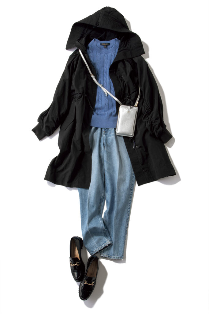ケーブルニット着回し ロンT¥11,550(スローン/ザ ショップ スローン 新静岡セノバ店)黒タイトスカート¥28,600〈ハウント/ハウント代官山〉シャカシャカアウター¥116,600(カナダグース/カナダグースジャパン)トートバッグ¥33,000(フィールアンドテイスト/ショールーム セッション)スマホバッグ¥17,600(ヴィオラドーロ/ピーチ)ソックス¥990(靴下屋/tabio)スニーカー¥37,400(オートリー/トヨダトレーディング プレスルーム)イヤリング¥3,300(アネモネ/サンポークリエイト)