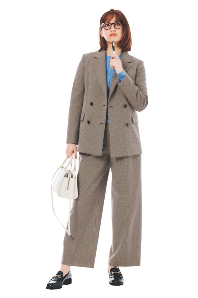 ケーブルニット着回し チェック柄セットアップジャケット¥24,200パンツ¥12,980(ともにオリヒカ/オリヒカ池袋東口店)バッグ¥209,000(J&M デヴィッドソン/J&M デヴィッドソン カスタマーセンター)シューズ¥45,100(ファビオ ルスコーニ/ファビオ ルスコーニ ジェイアール名古屋タカシマヤ店)メガネ¥40,700(アイヴァン/アイヴァン 東京ギャラリー)