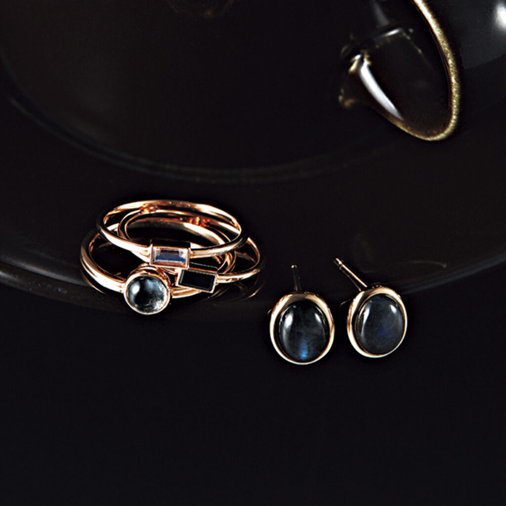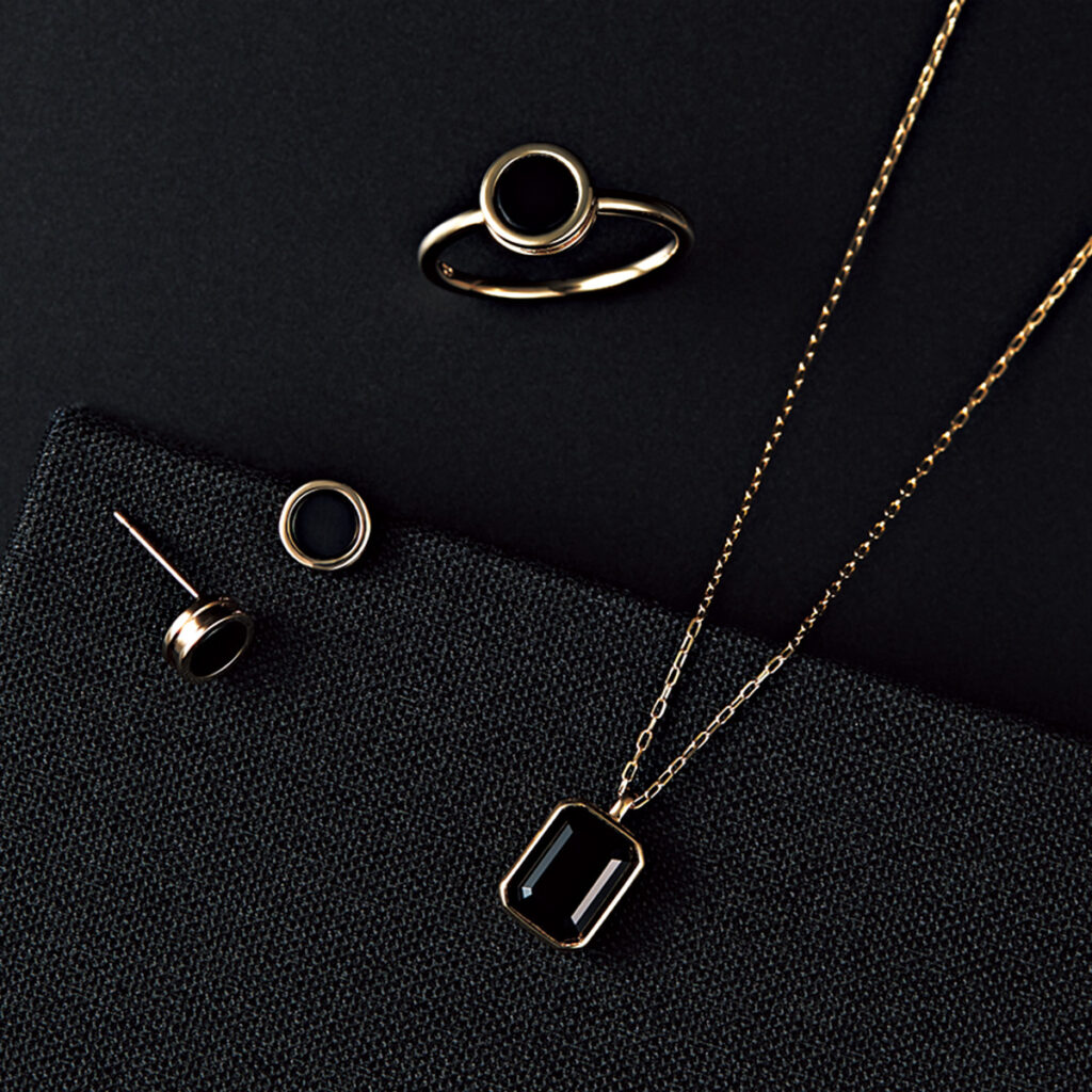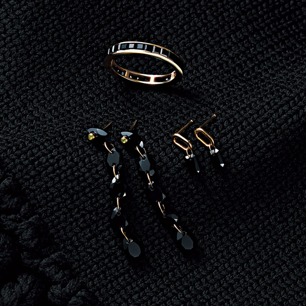 スクエアカットストーンが並ぶフルエタニティリングや、漆黒のきらめきに目を奪われるピアス。黒ならではの洗練された空気感をまとって。リングから時計まわりに・リング〈YG×ブラックスピネル〉¥59,400ピアス〈YG×ブラックスピネル〉¥19,800ロングピアス〈YG×オニキス〉¥25,300(ともにアルティーダ ウード)