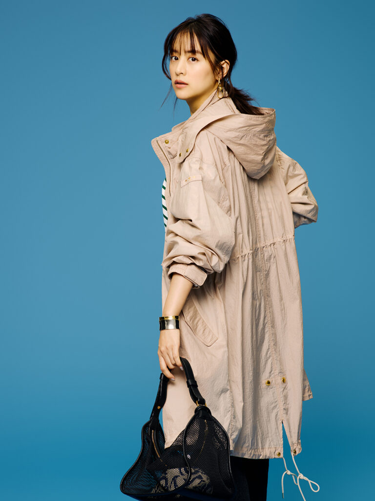 モッズコートのデザインを上質なナイロンタフタ地で仕上げた一着は、羽のように軽やかな着心地が特徴。微光沢のシワ加工素材、まろやかなベージュカラーがボーダー×デニムの着こなしを女性らしく格上げしてくれます。撥水加工つきでアクティブなお出かけにも◎。