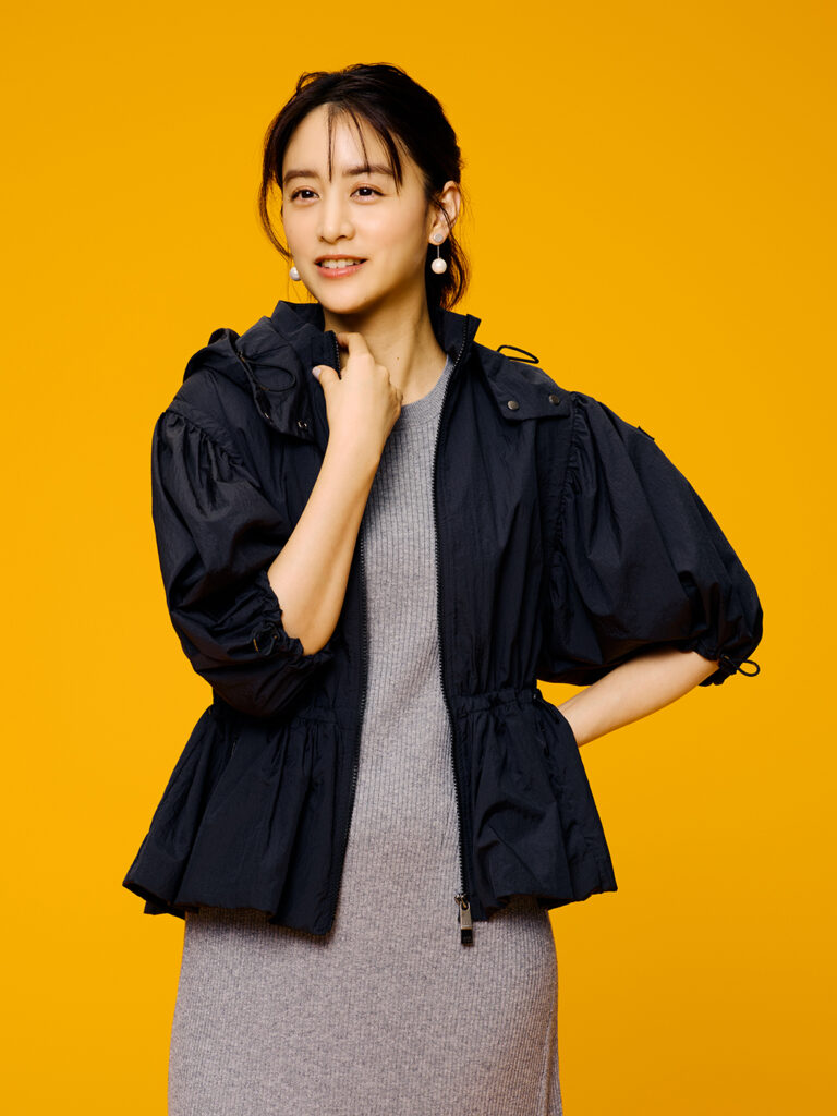 ふんわり袖が華やかなブルゾンは、ウエストのコードをしぼることでぺプラムのようなシルエットに。ボリューム袖が二の腕を、ふんわりした裾が腰まわりをさりげなくカモフラージュ。ブルゾンにデザイン性があるので、シンプルなアイテムとの合わせも着映え確実。