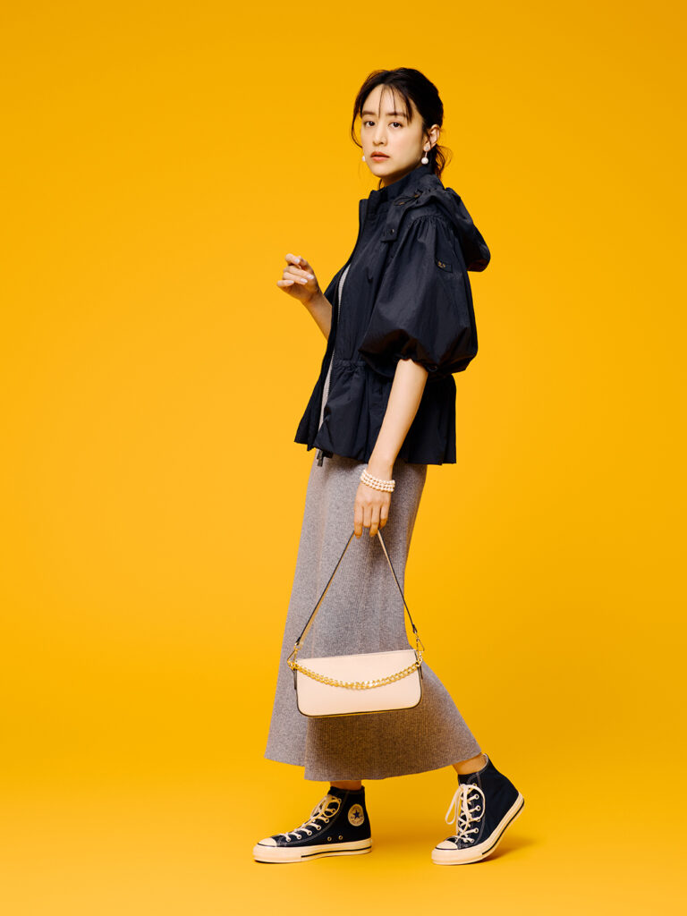 ジャケット「BEDA」¥70,400(タトラス/タトラス コンセプトストア 青山店)ワンピース¥23,100(アルページュストーリー/アルページュストーリー プレスルーム)バッグ¥17,600(メゾン ヴァンサン/フラッパーズ)スニーカー¥8,800(コンバース/コンバースインフォメーションセンター)ピアス¥5,940ブレスレット¥29,400(ともにアビステ)