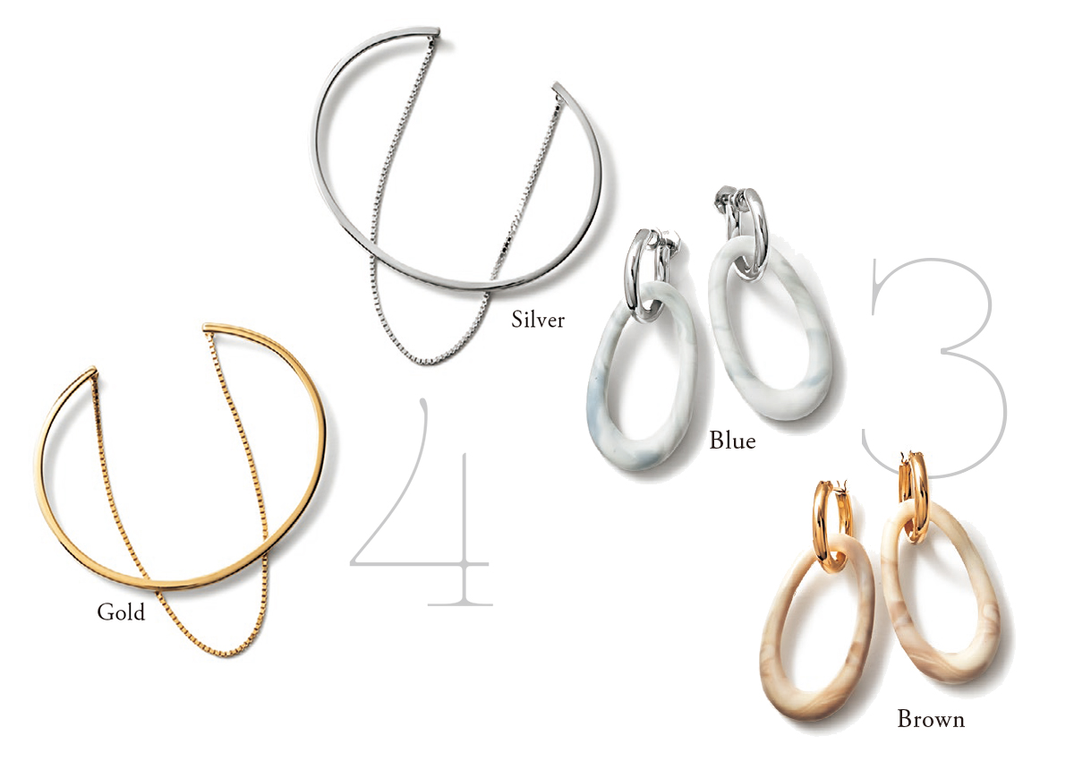 ひとつで今っぽさが叶う旬のジュエリーで、いつもの着こなしがグッとオシャレ度アップ。手持ちのジュエリーとも合わせやすいのが魅力です。ジルコニアサークルピアス¥18,000シルバー2連バングル¥14,000(ともにJouete)カットソー¥10,000(ルミノア/ゲストリスト)カーディガン¥32,000(ジョン スメドレー/リーミルズ エージェンシー)