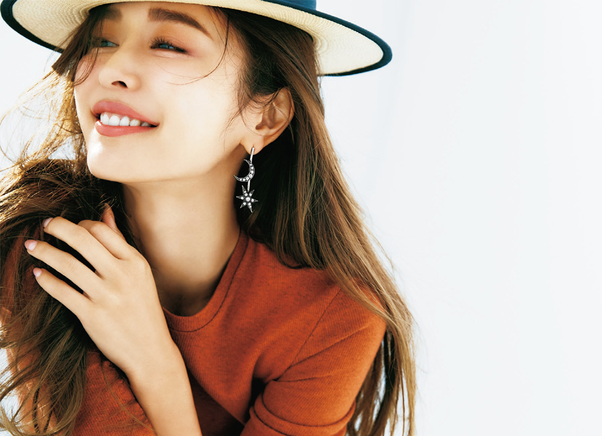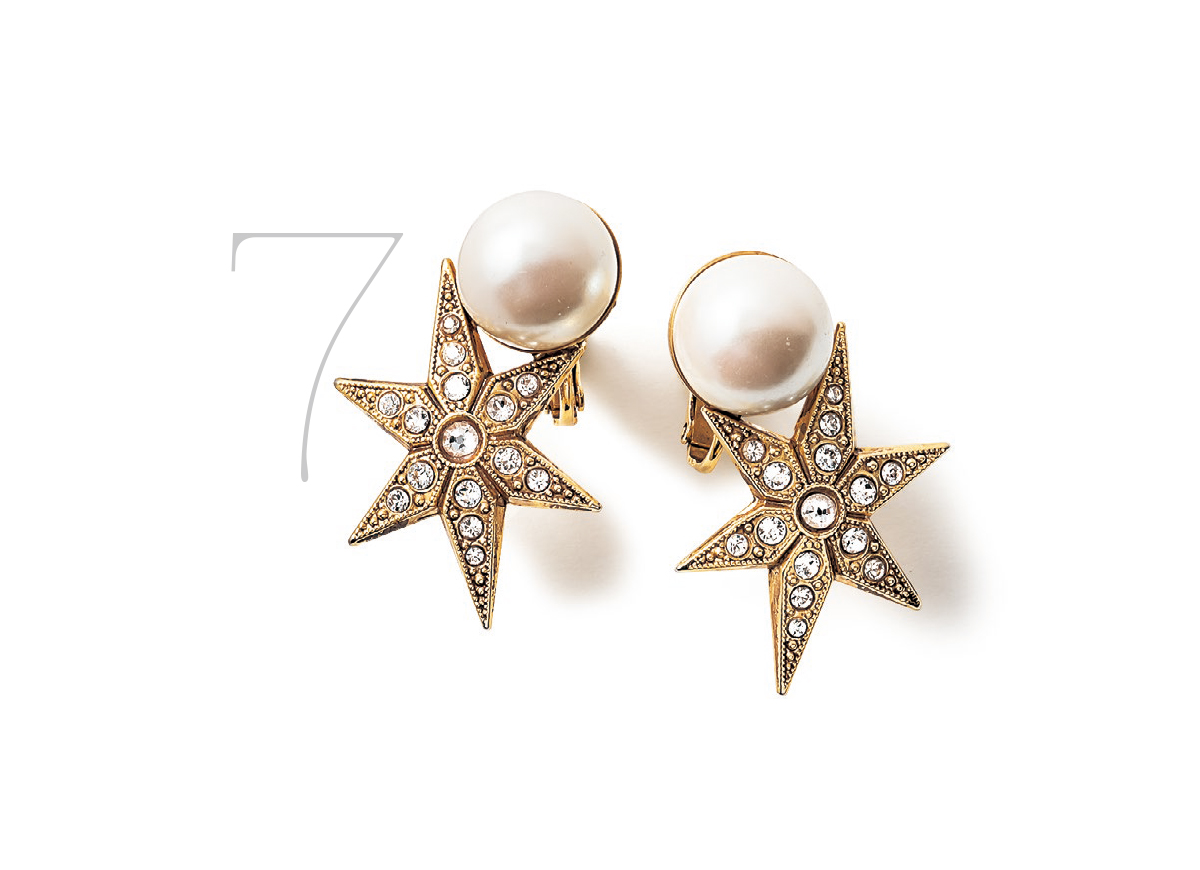 女のコなら誰もが心ときめくスターモチーフ&パールの組合せ。リッチな味わいのあるヴィンテージパーツを使用しているので、甘くなりがちなモチーフジュエリーもクラシカルで洗練された印象に。耳元のキュートな輝きで大人の愛らしさを感じさせて。スター&パールイヤリング¥15,000(ADER. bijoux)プルオーバー¥22,000(ティッカ)