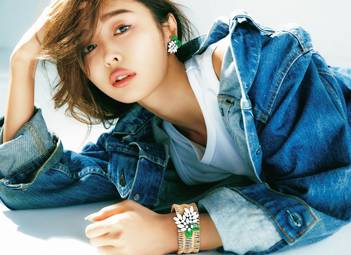 コスチュームジュエリーのようなクラシカルかつデコラティブなモチーフが新鮮。キャッチーなアクセでフェミニンな遊び心をプラスして。リライヤークリップ¥20,000リララタンバングル¥27,000(ともにADER. bijoux)カットソー¥6,500(ミューニック ヒュデン ジェム/ピーチ)デニムジャケット/スタイリスト私物