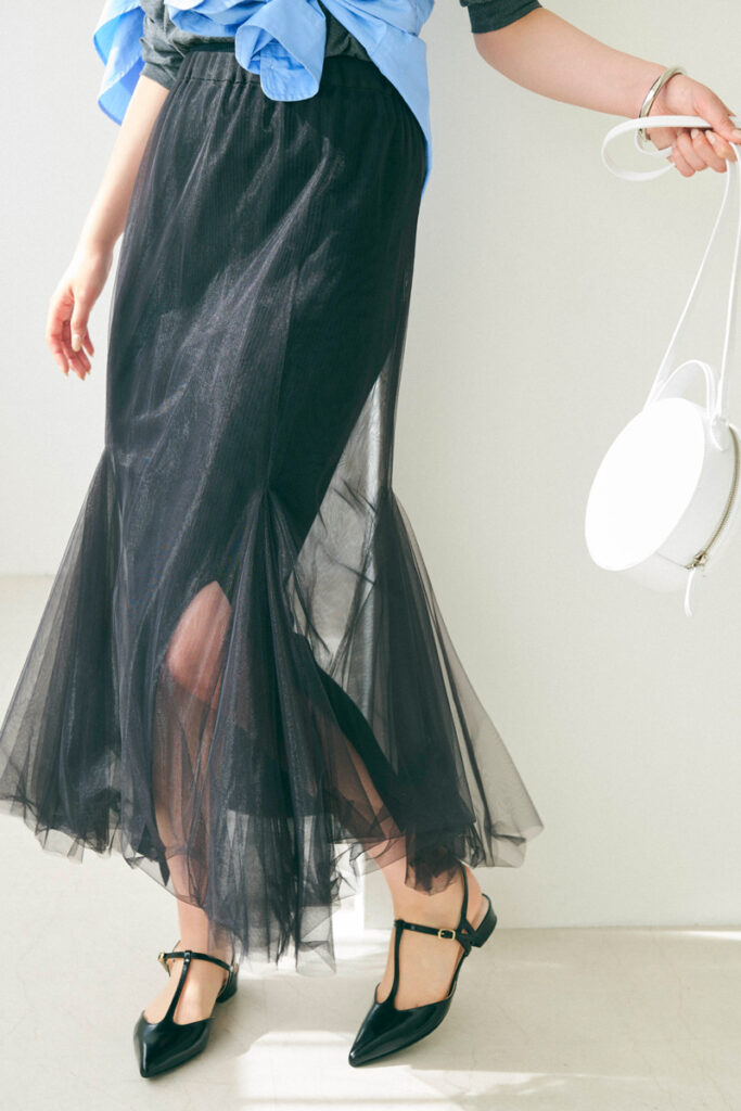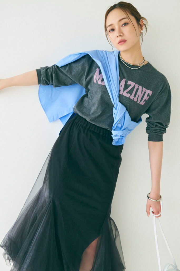 チュールスカート¥37,400タイトスカート¥20,900(ともにウィム ガゼット/ウィム ガゼット ルミネ新宿店)カットソー¥17,600(THIRD MAGAZINE)シャツ¥19,530(ザ シンゾーン/シンゾーン ルミネ新宿店)バッグ¥74,800(ロンシャン/ロンシャン ・ジャパン)シューズ¥17,600(ダイアナ/ダイアナ 銀座本店)ピアス¥2,200バングル¥2,640(ともにアネモネ/サンポークリエイト)ネックレス¥19,800(IRIS47/Hooves)