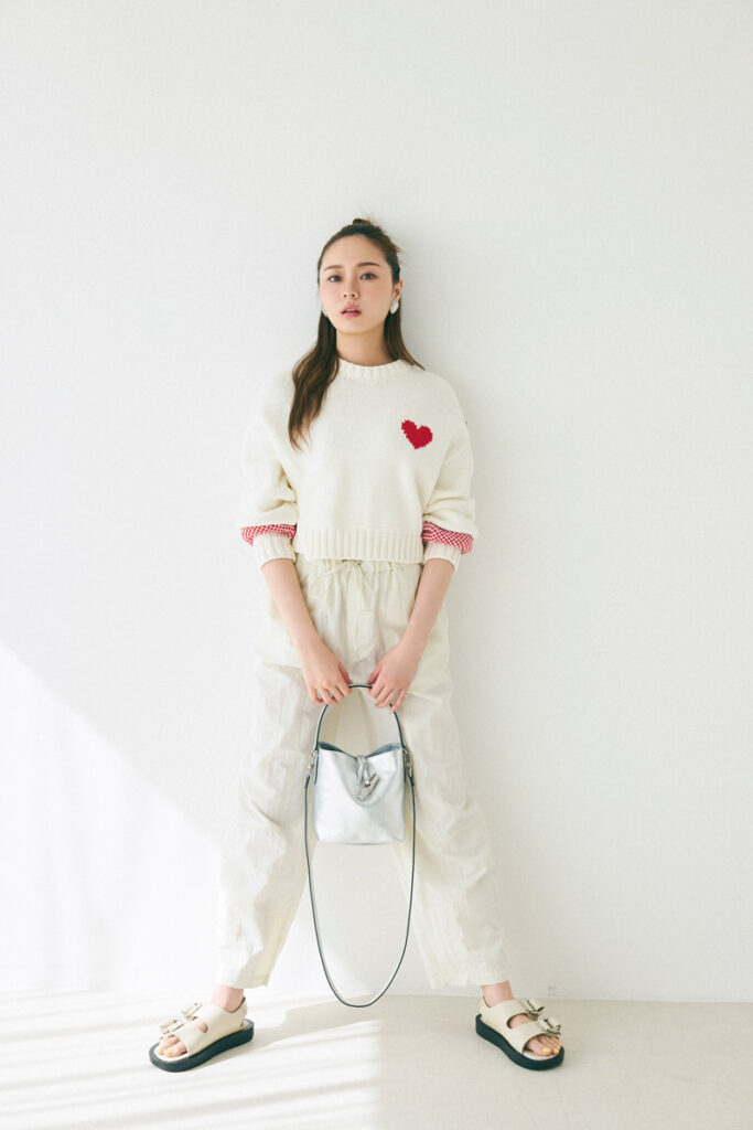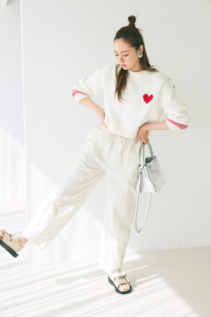アクセサリーからジワジワとトレンドになっていた“ハートモチーフ”。今季はいよいよ洋服にもその波が! アラサー世代が着こなすには“ラブリーに見せない”のがポイントです。胸元にワンポイント&袖のさりげないチビハート柄がキュートなニットはカジュアルボトムスとサンダルで合わせて大人っぽく。赤のハートを差し色にしつつ、全体的にホワイトでまとめたワントーンコーデに仕上げるのが正解です。バッグでメタリックを効かせて、コーデを引き締めるのも重要ポイント。