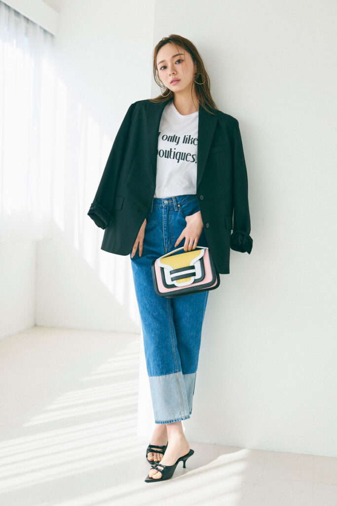 ミュール[ヒール5.5cm]¥91,300(ジアボルギーニ/ラディモ・インク)ジャケット¥23,100(ステートオブマインド/ゲストリスト)Tシャツ¥9,350(マルティニーク/マルティニーク ルミネ横浜)パンツ¥26,400(トラディショナル ウェザーウェア/トラディショナル ウェザーウェア ルミネ有楽町店)バッグ¥170,500(ピエール アルディ/ピエール アルディ 東京)イヤリング¥12,100(マージョリー・ベア/ココシュニック新宿タカシマヤ店)