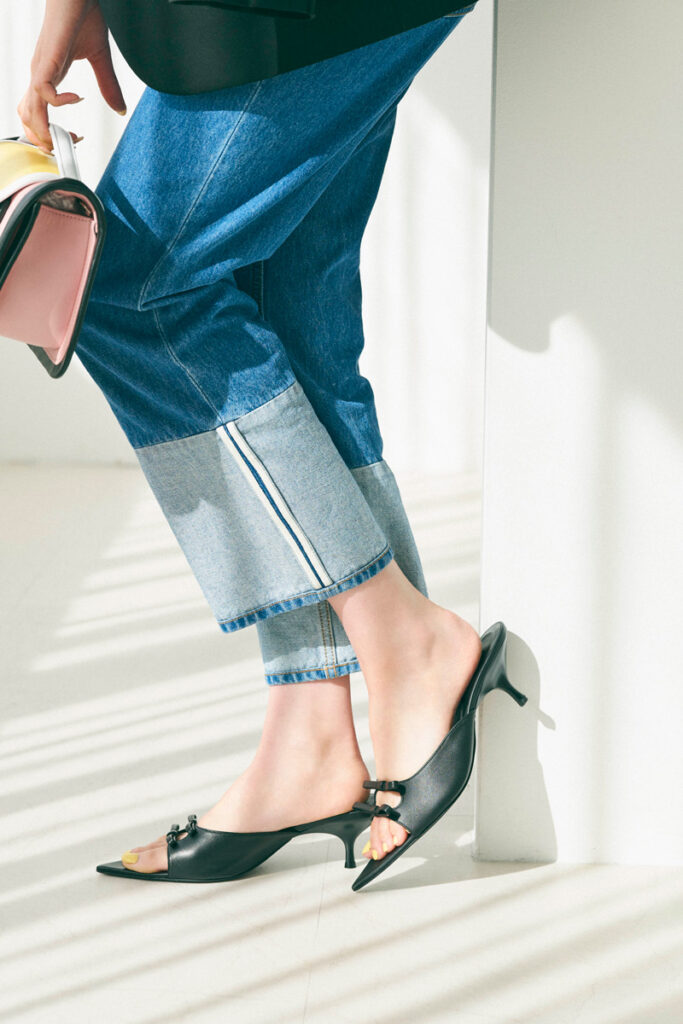 定番デニムコーデこそレディハンサムに導きたいのが今季の気分。いつもならフラットシューズを合わせていたコーデにミュールを投入してみると…それだけでグッとスタイリッシュな印象に。リボンデザイン×ポインテッドトゥ×ブラックの絶妙なバランス感が今どきモード感を叶えます。足元で遊びを取り入れるぶん、他のアイテムはいつものテンションでまとめるのも着こなしを成功させる秘訣。