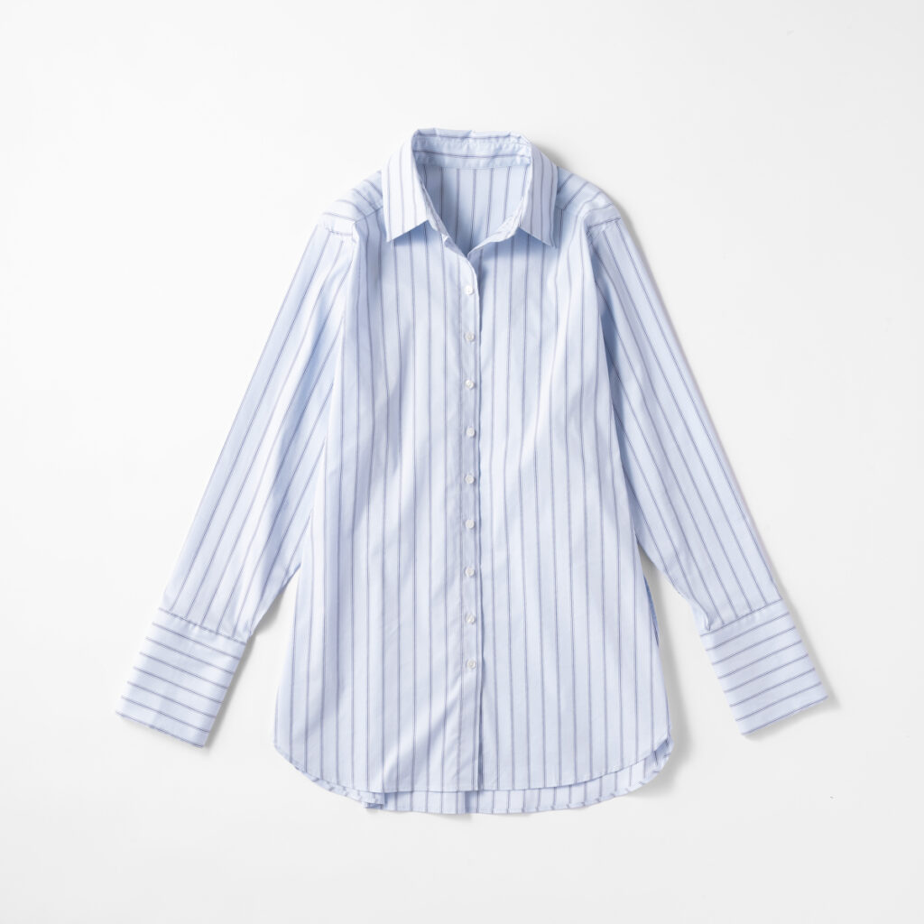「キレイ色コーデを大人っぽく着るには、爽やかさを印象づけてくれるブルーがおすすめ。笹崎さん、プライベートではデニムをよく穿くとのことでしたよね。今回はトップスが挑戦アイテムなので、ボトムは穿き慣れたデニムにしましょう!」(スタイリスト平沼さん)