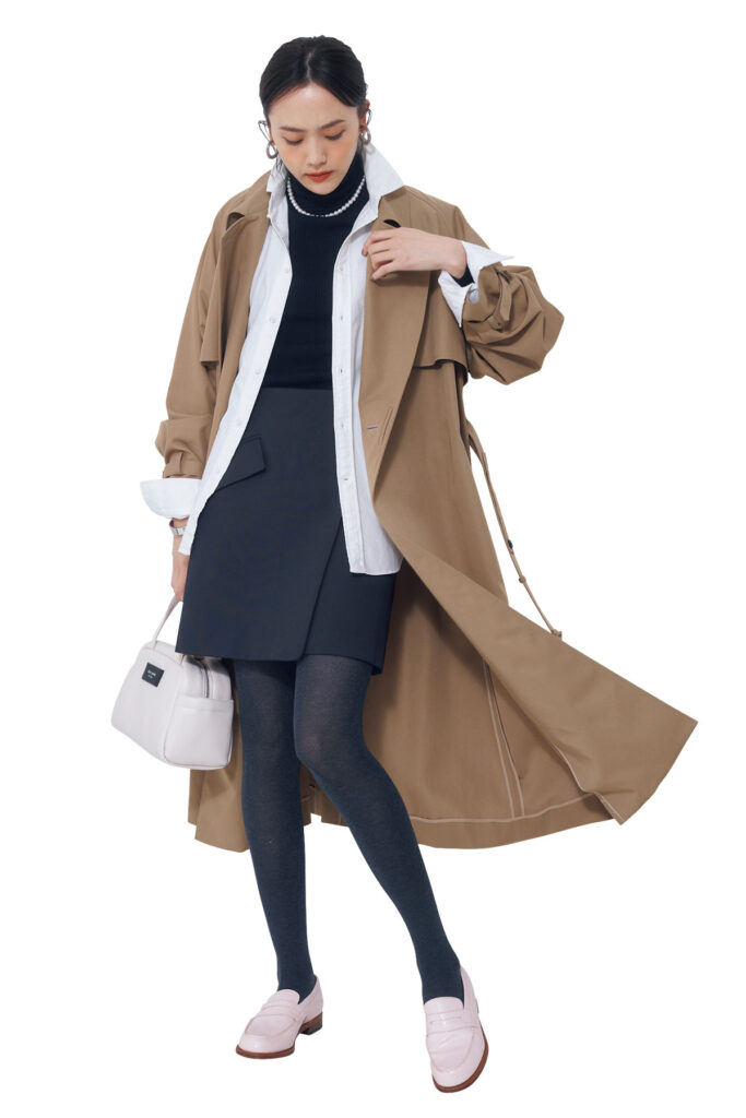トレンチにGジャンを重ねるのもオシャレだけど、この春は白シャツレイヤードもおすすめ!黒タートル一枚でも成立するところを、白シャツのワンクッションで清潔感と春らしさを高めて。ニット¥26,400(スローン/ザ ショップ スローン 新静岡セノバ店)シャツ¥22,000(ポロ ラルフ ローレン/ラルフ ローレン)トレンチコート¥92,400(ハイク/ボウルズ)スカート¥28,600(エストネーション)バッグ¥64,900(ケイト・スペード ニューヨーク/ケイト・スペード カスタマーサービス)ローファー¥137,500(ジェイエムウエストン/ジェイエムウエストン 青山店)イヤリング¥6,090ネックレス¥10,800バングル¥8,640(すべてアビステ)タイツ/スタイリスト私物