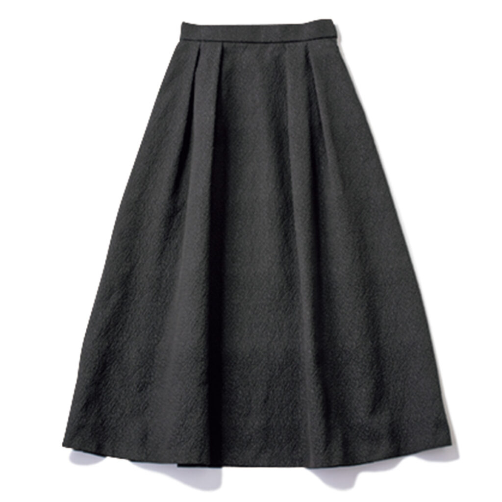 ハリと光沢があるので1枚で着映え感あり。オールブラックでまとめてもほんのり甘く大人可愛い雰囲気に。ジャカードなのに洗濯機で洗える手軽さも◎。¥13,000(PLST) -