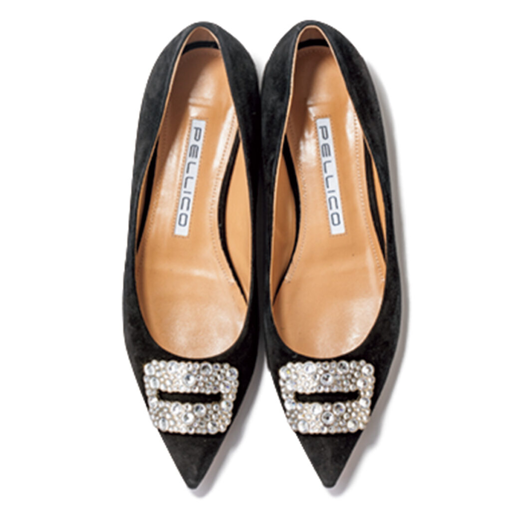 シンプルコーデに華やぎを添えてくれるビジュー付きデザイン。黒ならモノトーン服のカッコよさはそのままに、ちょうどいい女らしさが宿ります。¥89,100(ペリーコ/アマン) -