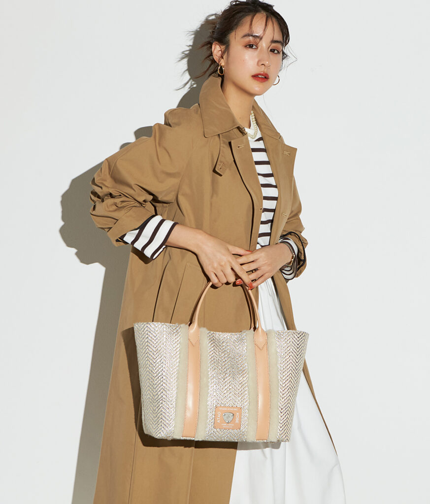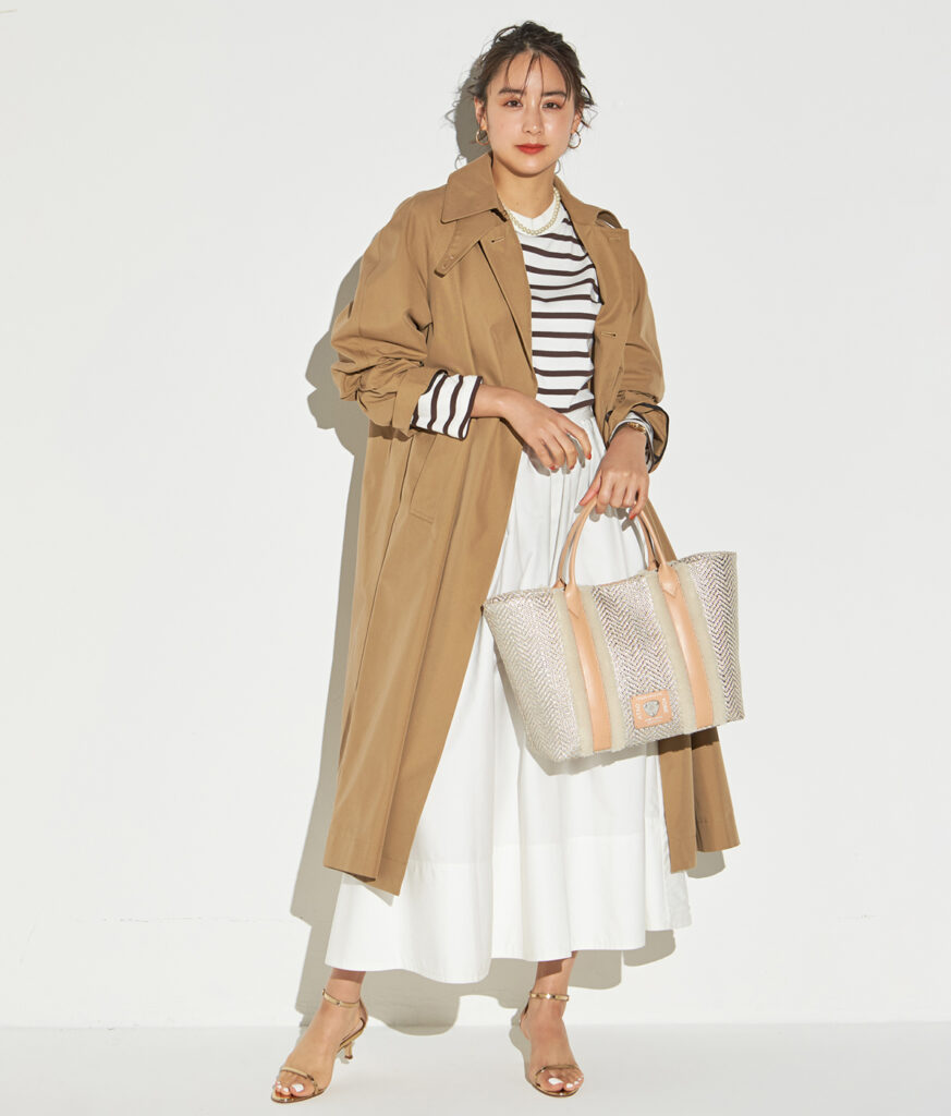 バッグ「shiki」〈H25×W31×D12〉¥38,500(アタオ/スタジオアタオ)コート¥37,400(アルページュストーリー/アルページュストーリー プレスルーム)ボーダーカットソー¥17,600(ダブルスタンダードクロージング/フィルム)スカート¥18,000(バナナ・リパブリック)サンダル¥59,400(ネブローニ)ピアス¥58,300(モニス/フォーティーン ショールーム)ネックレス¥8,400(アビステ)時計¥14,850(クルース/HIROB ルミネ新宿店)