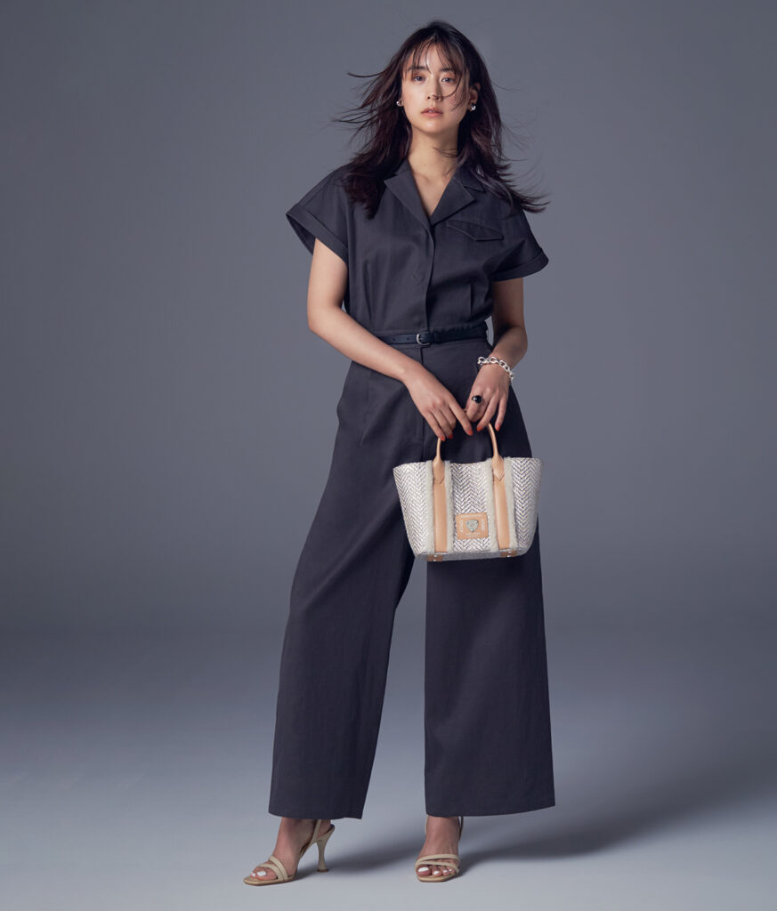 バッグ「小さいshiki」〈H18×W21×D9〉¥35,200(アタオ/スタジオアタオ)オールインワン¥33,000(アンクレイヴ ホワイト/アンクレイヴ)サンダル¥19,800(ダイアナ/ダイアナ 銀座本店)イヤリング¥6,600ブレスレット¥16,200(ともにアビステ)リング¥22,000(オンブル ビジュー/フォーティーン ショールーム)
