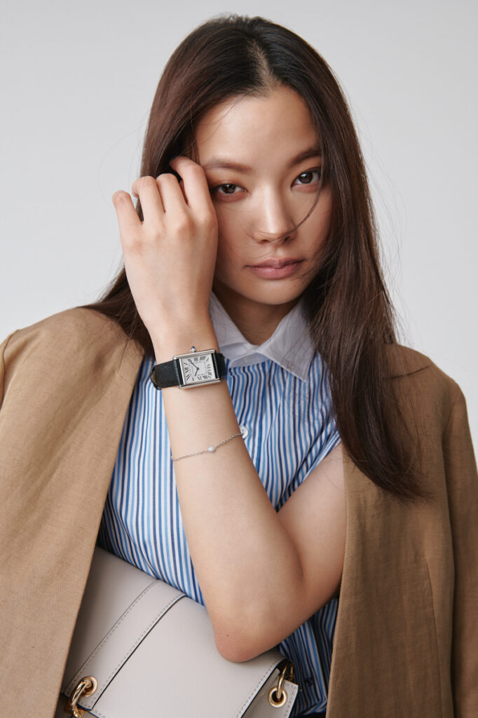 クラシックとコンテンポラリーが共存する中性的な佇まいはシャツやジャケットスタイルにはもちろん、ふわりとしたスカートやブラウスにも寄り添ってくれます。時計「タンク マスト」¥522,500 ブレスレット「カルティエ ダムール」SM¥163,900(すべてカルティエ/カルティエ カスタマー サービスセンター)ジャケット¥53,900(アンタイトル)シャツ¥35,200(オム ガールズ/エイチ ビューティー&ユース)パンツ¥88,000(ターン ストゥディオ/ユナイテッドアローズ 原宿本店)バッグ¥7,920(カランシエル/シップス インフォメーションセンター)靴¥59,400(ネブローニ)