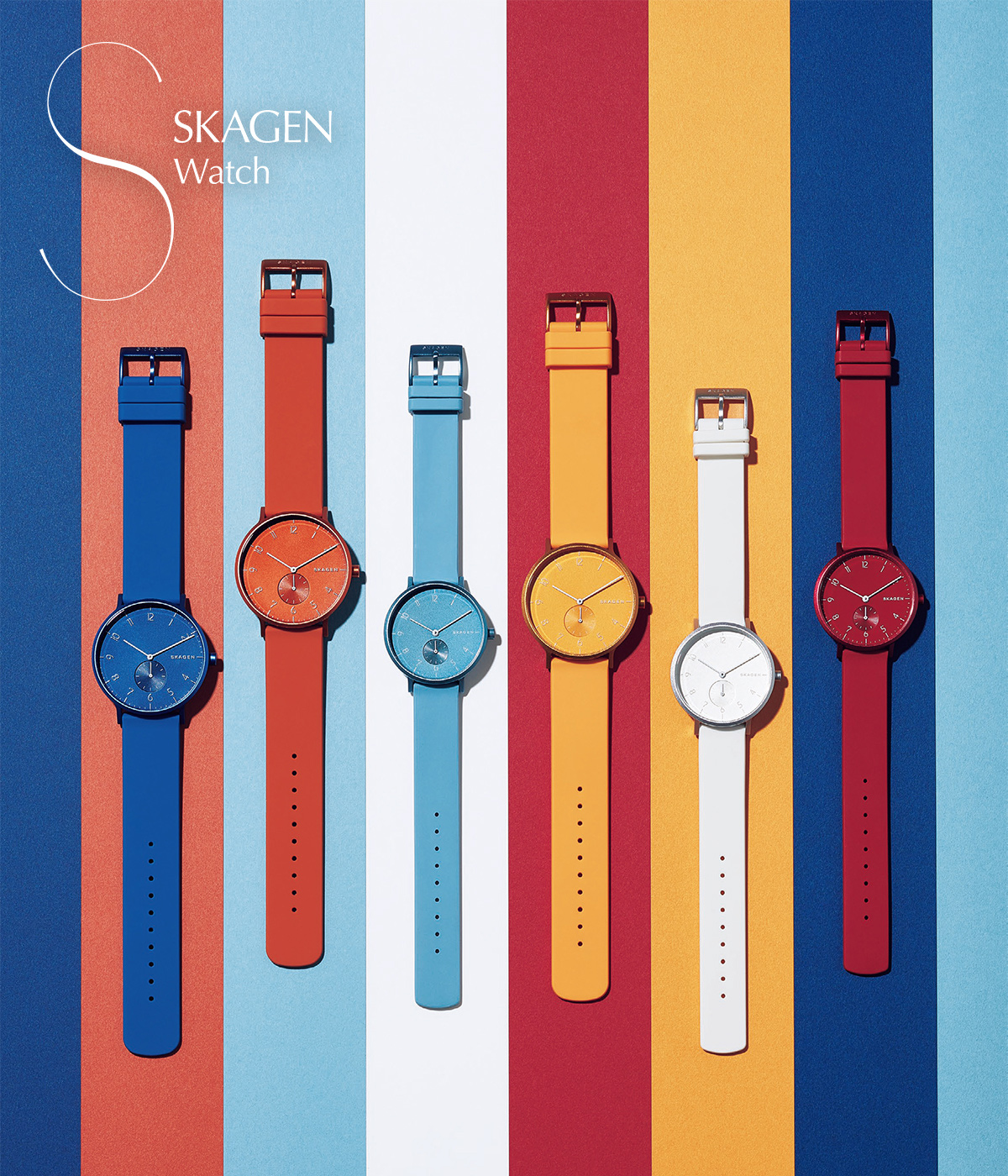 左から腕時計〈ブルー、41mm〉〈オレンジ、41mm〉〈ライトブルー、36mm〉〈イエロー、41mm〉〈ホワイト、36mm〉〈レッド、41mm〉 各¥14,000(すべてスカーゲン/フォッシルジャパン)