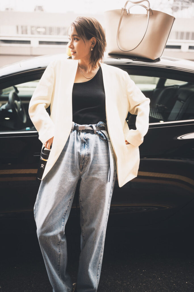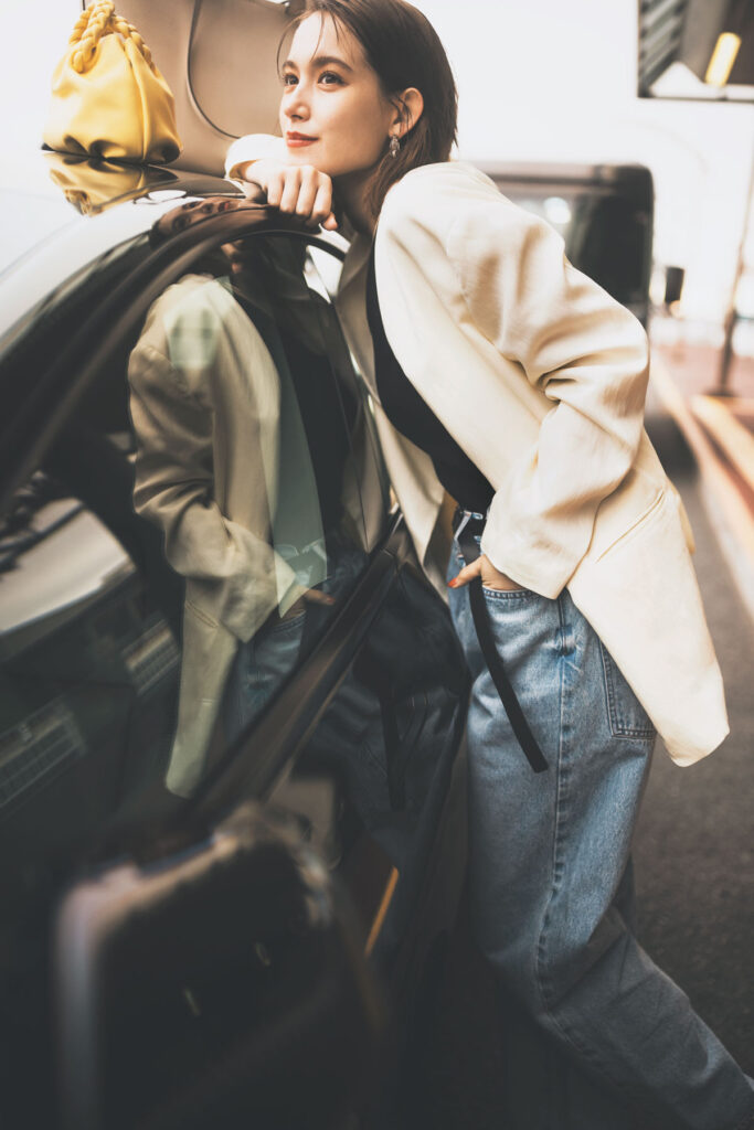 お互いデニムで、さりげなくおソロにしても楽しい彼とのふたり旅。カーデライクなノーカラーのジャケットを選べば、気張って見えず心地いい。座り続けても苦しくならない、ゆるデニムが鉄板。