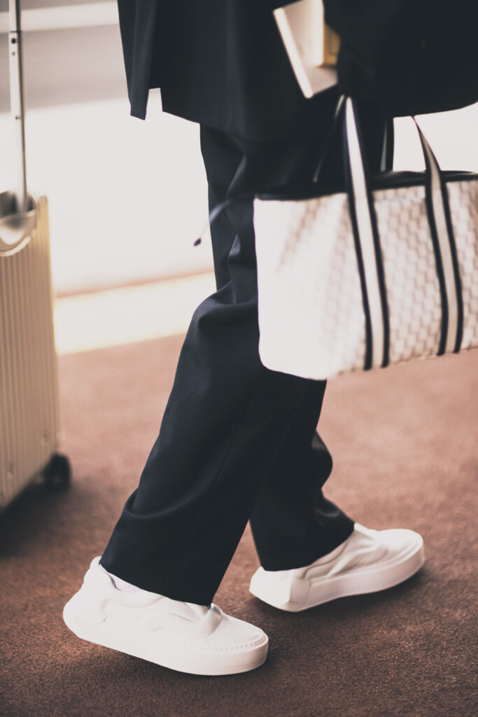 誰かと旅する以上にきちんと感を意識したいソロ旅。ホテルチェックイン、アートスポット、ひとりごはんetc. どんなシーンでもスマートでいられるジャケパンセットアップが適任。クリーンな白レザーのスニーカーで足元もキレイめに。
