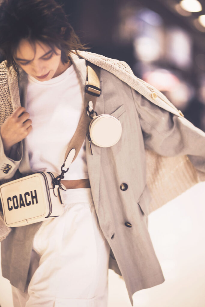 ジャケット1枚だと寒い場合は、大判ストール感覚でゆるカーデを投入。首に巻いたり、ジャケットを脱いで羽織ったりと万能で、寒暖差にも対応。足元はソックス×サンダルで。ジャケット¥86,900(サクラ/インターリブ)タンクトップ¥8,800(イウエン マトフ/ユナイテッドアローズ 渋谷スクランブルスクエア店)カーディガン¥30,800(ウィム ガゼット/ウィム ガゼット ルミネ新宿店)パンツ¥19,910(リネイヴ/オン ワード樫山)ソックス[2足セット]¥1,320(ニューエラ)斜めがけバッグ¥66,000トートバッグ¥82,500(ともにコーチ/コーチ・カスタマーサービス・ジャパン)サンダル¥53,900(プリュスバイショセ/ギャルリー・ヴィー 丸の内店)