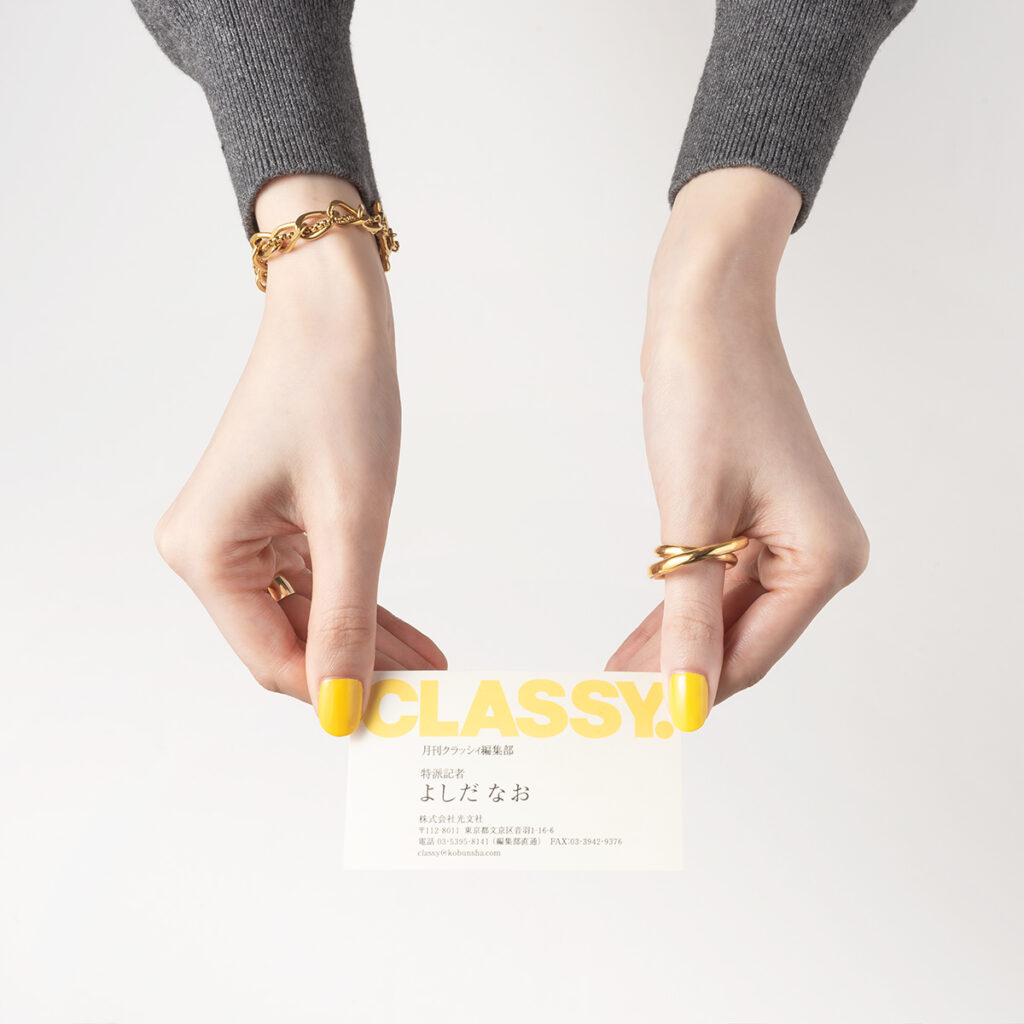 仕事の「はじめまして」シーンでは欠かせない、名刺の交換。その時、名刺を持つネイルの指先やジュエリーもあなたの第一印象の大切な一部になっているはず。肌カラーも意識して、この春の大人にふさわいしい手元を考えてみました!
