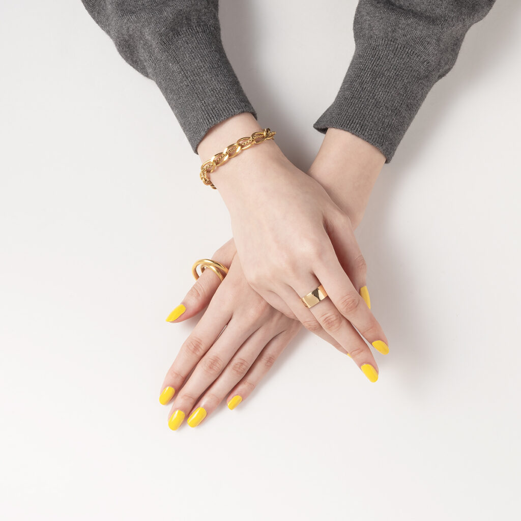 イエベにぴったりの、ぱっと目を引く流行りのイエローネイル。蛍光やグリーンがかっているイエローは肌をくすんで見せるのでNG。オレンジ味のあるイエローが狙い目です。