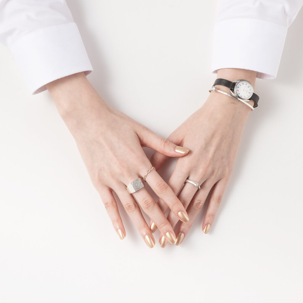 仕事の「はじめまして」シーンでは欠かせない、名刺の交換。その時、名刺を持つネイルの指先やジュエリーもあなたの第一印象の大切な一部になっているはず。肌カラーも意識して、この春の大人にふさわいしい手元を考えてみました!