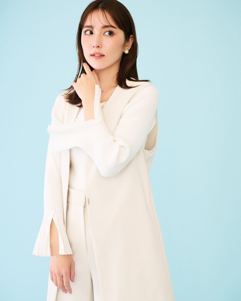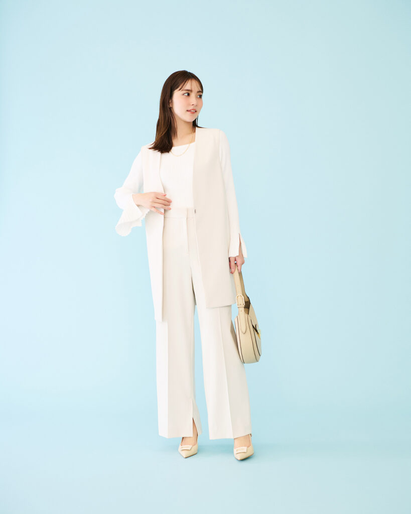 「個人的な意見ですが、黒や紺といったダークな色よりも、ベージュや白など明るい色のほうが保険業界が求める人材に近づけるのではと思い、実際に自分もベージュの服が多めです(笑)。ワンツーコーデじゃなく、ジャケットやジレなど羽織りものを取り入れたコーデを選ぶほうが機能的で洒落感も出る気がします」(Y・Mさん)