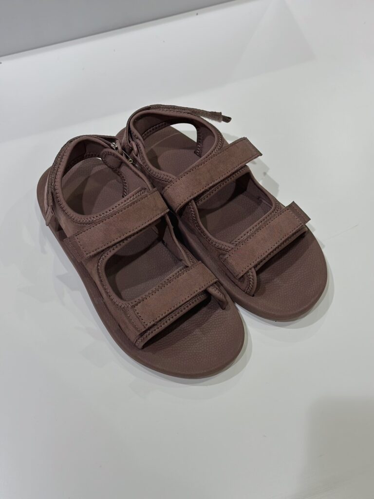 マジックテープで着脱しやすく、足の甲からかかとを優しくホールドしてくれる3箇所のストラップが特徴的。スウェード調の落ち着いた生地で、大人女子でも取り入れやすい。足裏になじむソールでずり落ちにくく、長時間履いても疲れません。