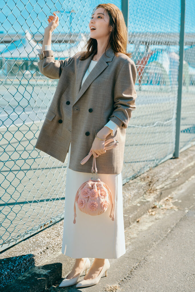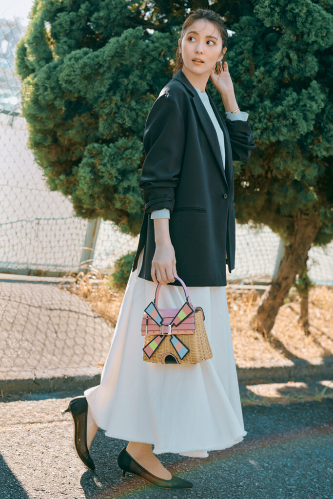 カーディガン・バッグ・靴の3点に春らしいパステルカラーを効かせて。優しげトーンの差し色なら、ベーシックとも相性よく、悪目立ちしない華やかさで好感度もばっちりです。ジャケット¥108,900(マディソンブルー)肩に掛けたニット¥36,300(エブール フォー ロンハーマン/ロンハーマン)Tシャツ¥9,680(カオス/カオス丸の内)スカート¥41,800(ソブ/フィルム)バッグ¥143,000(ピエール アルディ/ピエール アルディ 東京)パンプス¥57,200(ネブローニ)ピアス¥16,060(バルブス/ZUTTOHOLIC)ネックレス¥31,900(マリハ)バングル¥77,000(リューク)