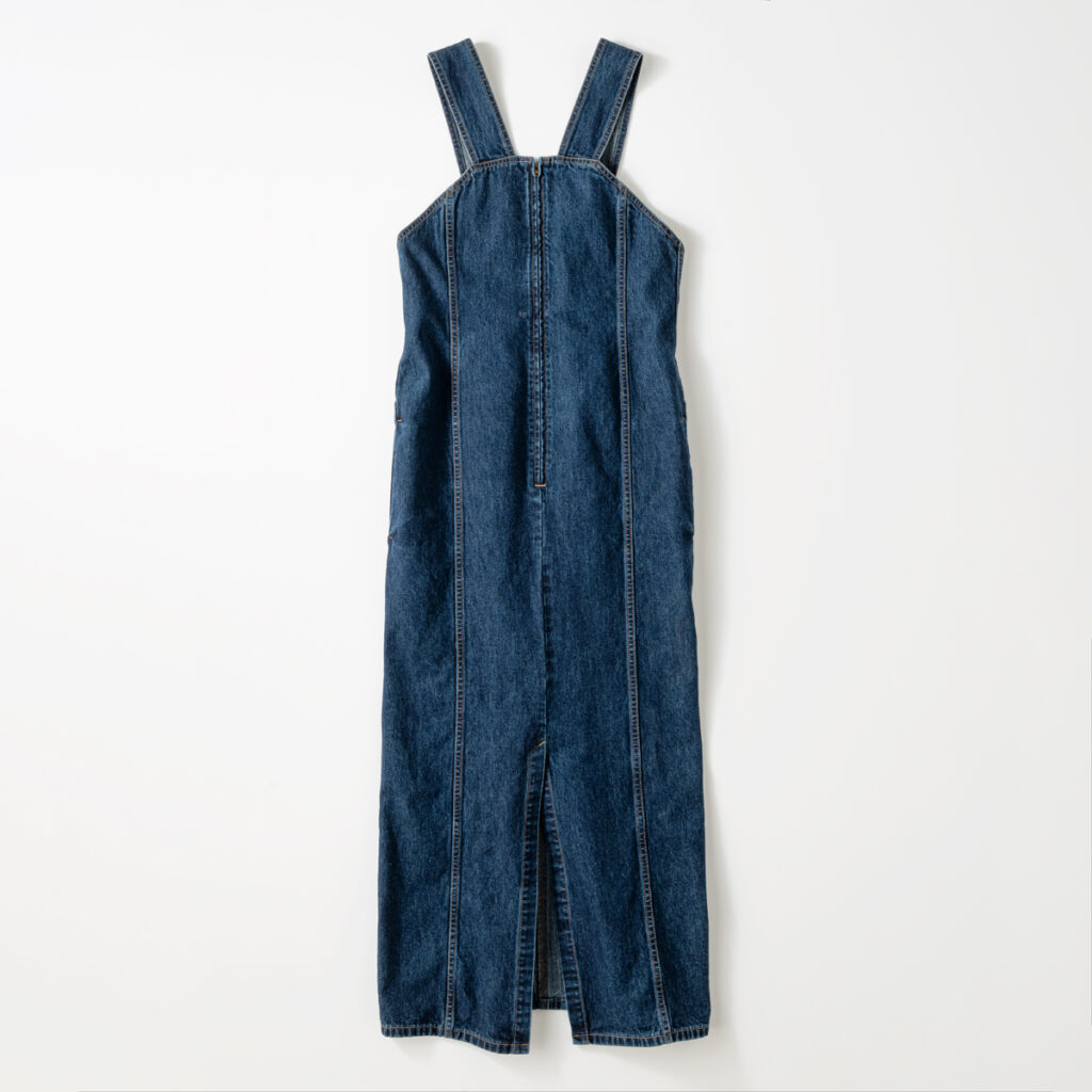 ボディラインに沿うようなIラインシルエットが美しいデニムワンピースはほどよくヘルシーな色気がポイント。バックは深めのVカット。背中にデザインのあるインナーを合わせて、バックシャンコーデを楽しむのも◎。