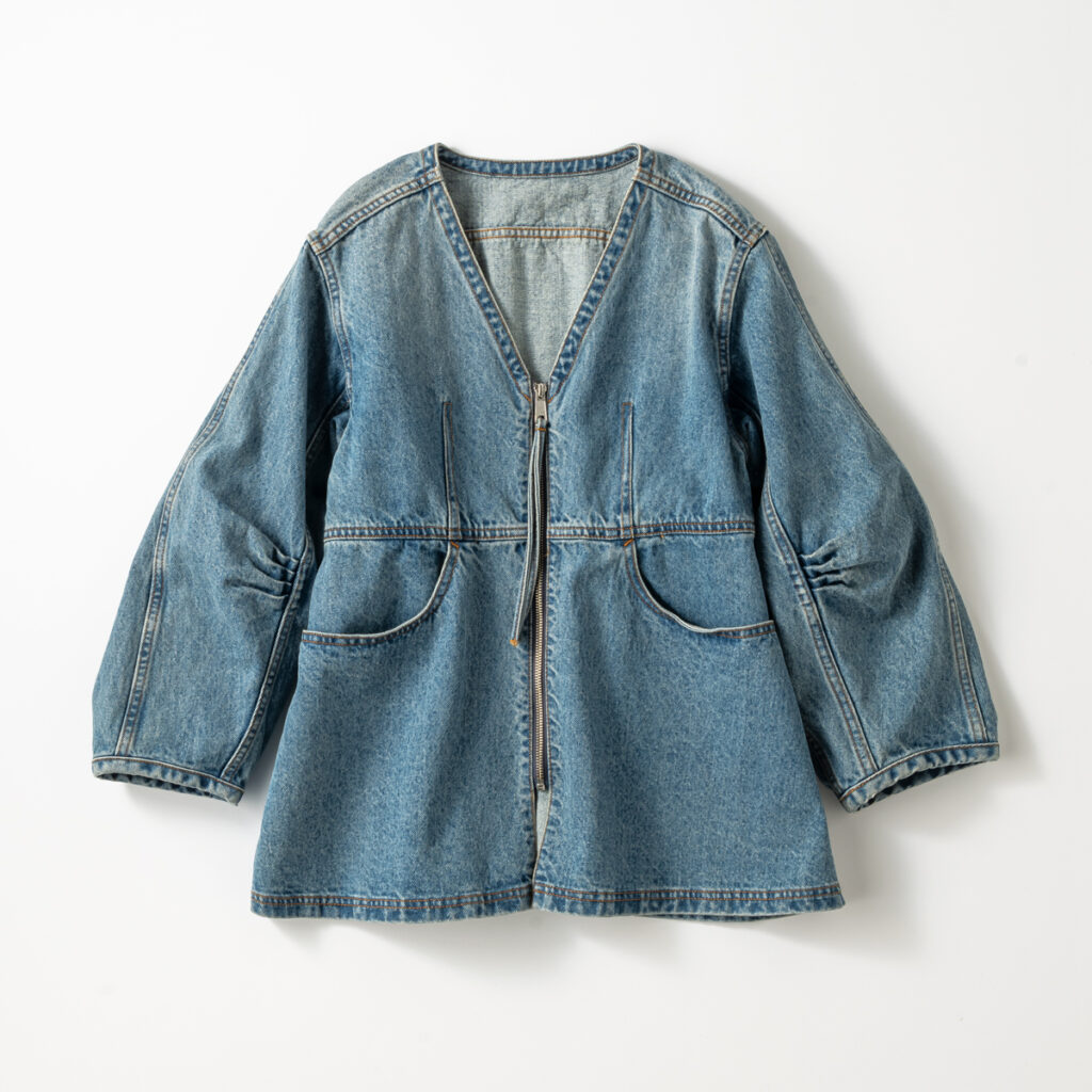 ウエストラインをキュッと絞ったペプラムシルエットが魅力的なチュニック。ヴィンテージライクな素材やVネック、フロントジップのモードなエッセンスとボリューム袖の甘さのバランスが絶妙。フロントジップを開ければ羽織としても着用できます。