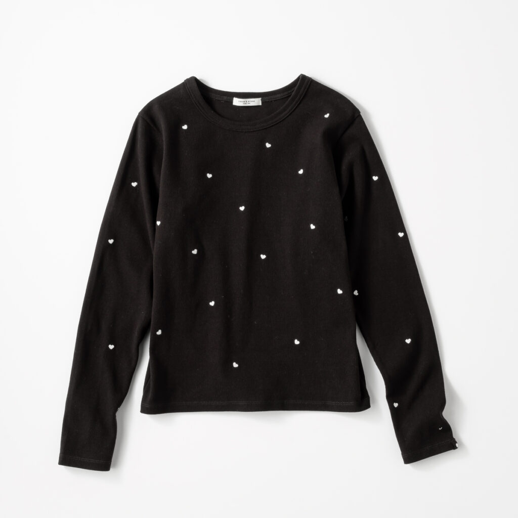 控えめに散りばめられたハートの刺繍がアクセントのカットソー。モノトーンなら甘くなりすぎず、合わせるボトムスも選びません。トレンド感も使い勝手もばっちりのアイテムは、1点あると重宝すること間違いなし。