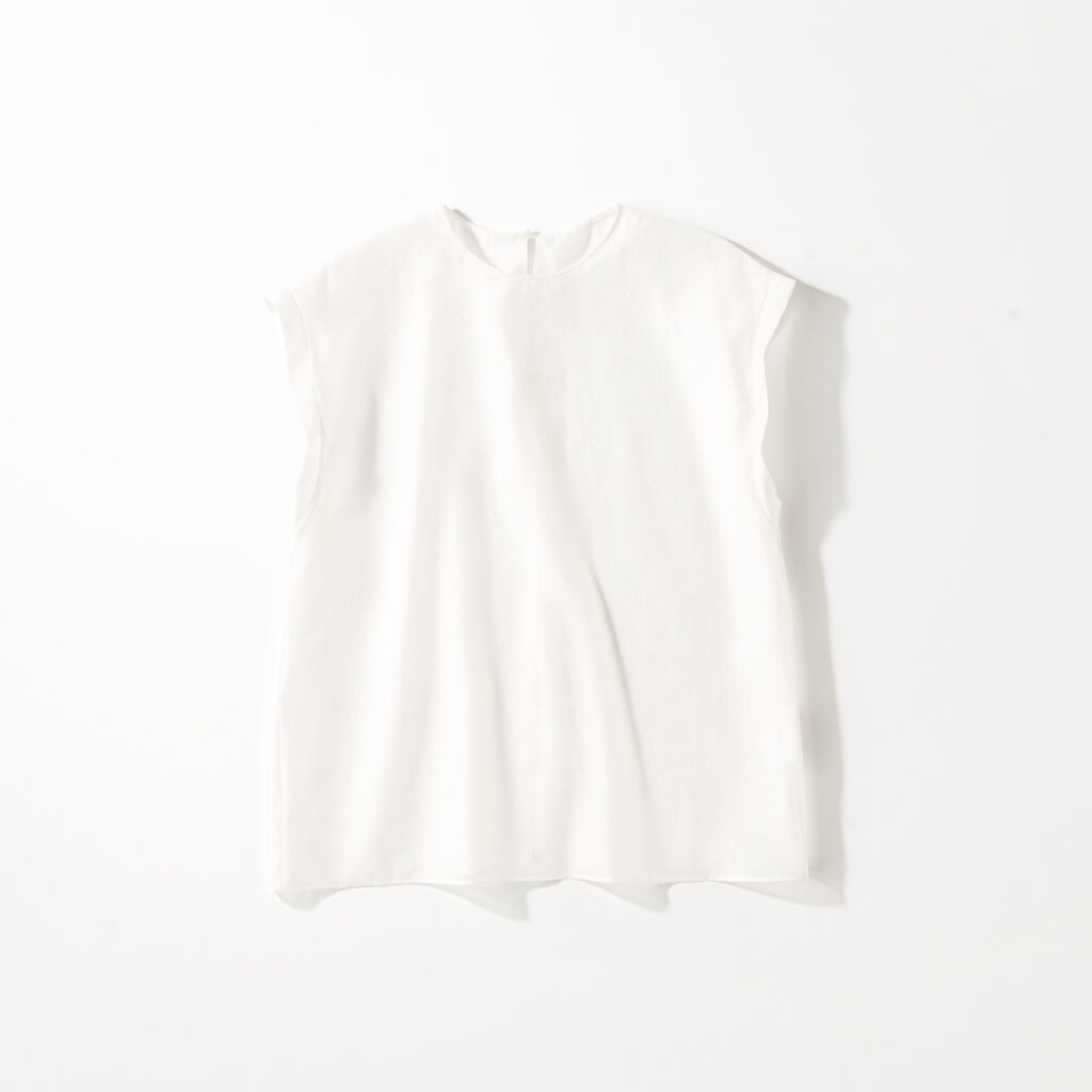 タックがたっぷりと入ったメンズライクなボトムス&襟が上向きに尖ったピークドラペルとほんのりシェイプしたボックスシルエットのジレでほどよくシャープな印象に。リネンコットンのシャンブレー生地が柔らかな風合いを表現。