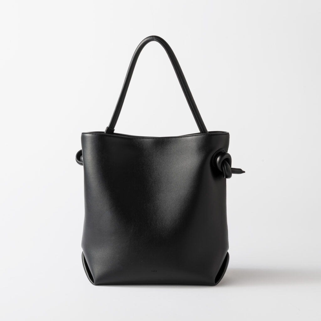 白のステッチをアクセントにしたキャンバス×レザーのコンビネーションが、シックな雰囲気。太めのショルダーストラップは長さ調節可能。どんなコーデにも合わせやすいブラックのバケット型バッグは、ひとつ持っておいて損はナシ!