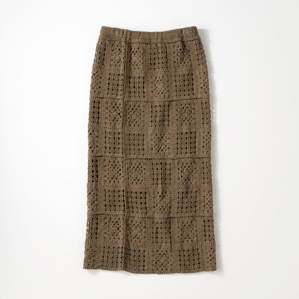 ざっくり編み素材のニットのペンシル型スカートは膝下までしかペチコートがなく、足元にほどよい透け感をもたらしてくれるデザイン。膝下のチラ透けは肌見せ初心者さんでも挑戦しやすい! 甘めのアイテムなので、カジュアルなアイテムと合わせるのがおすすめ。