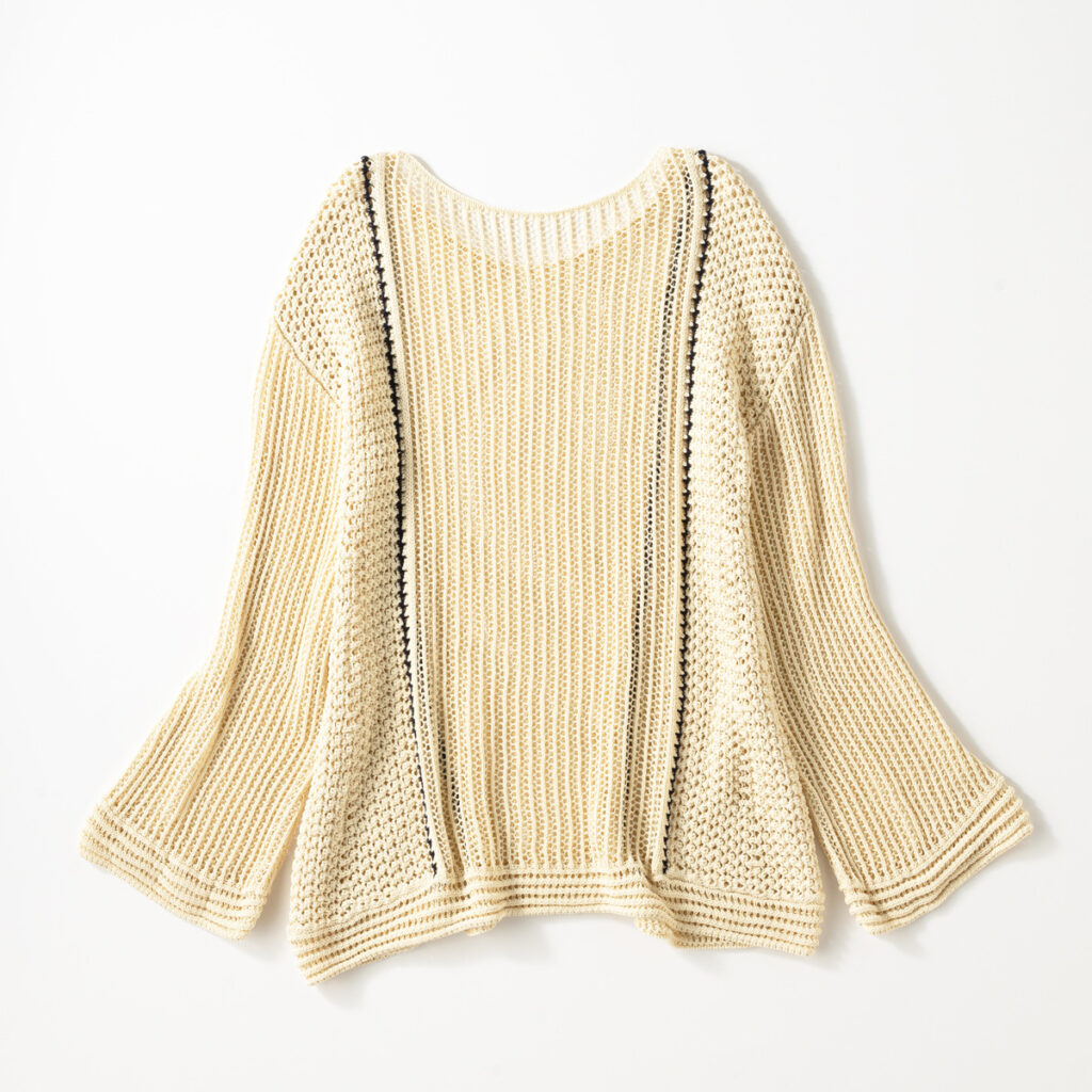 昨年も人気だったマルティニークのメッシュニットが、ニットの地柄を複雑にし、編み目の幅を変えてアップデート。ドライタッチなペーパー素材の質感がユニークで、シャープな印象に仕上がります。夏には重く感じるブラックも、透け感があるので軽やか!