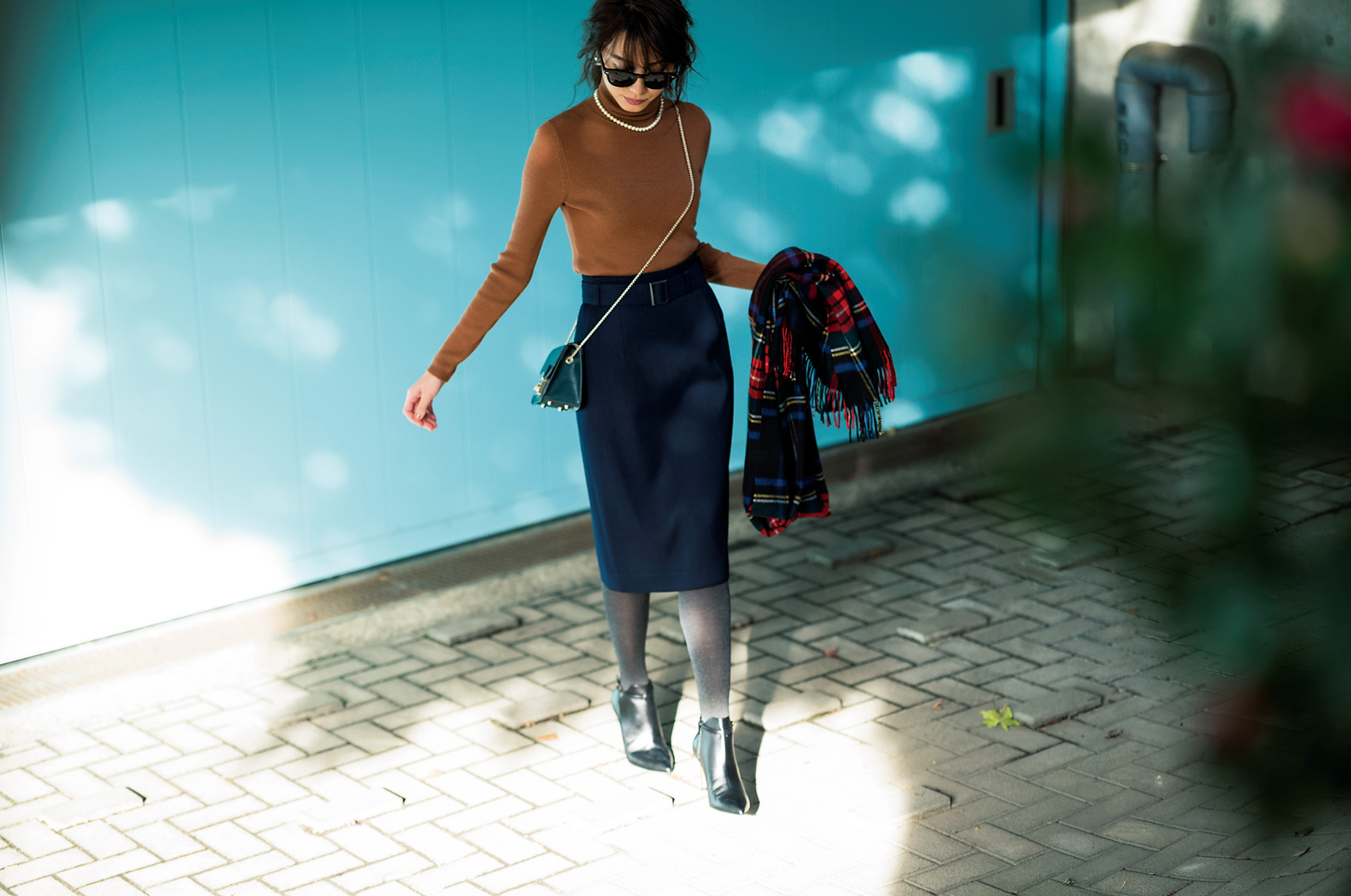 ニット¥1,990(UNIQLO)スカート¥22,000(ANAY)バッグ¥42,000(FURLA/FURLA JAPAN)ストール¥62,000(ジョンストンズ/リーミルズ エージェンシー)ブーツ¥34,000(メダ/モード・エ・ジャコモ)サングラス¥33,000(オリバー ピープルズ/オリバー ピープルズ 東京ギャラリー)イヤリング¥7,300(imac)ネックレス¥7,778(アビステ)タイツ¥1,800(17℃/17℃ by Blondollルミネ有楽町店)