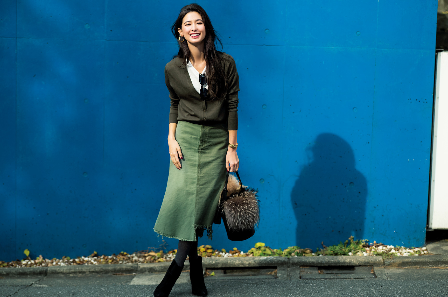 カーディガン¥2,990(UNIQLO)Tシャツ¥8,500(モンロー/ファッションピークス)スカート¥24,000(モロコバー/モロコバー 六本木ヒルズ店)バッグ¥8,900(キャセリーニ)ファーストール¥36,000(ルーニィ)ブーツ¥23,500(ダイアナ/ダイアナ 銀座本店)サングラス¥33,000(オリバーピープルズ/オリバーピープルズ 東京ギャラリー)イヤリング¥6,300(imac)バングル¥17,000(フィリップ オーディベール/ノーリーズ銀座本店)タイツ¥1,800(17℃/17℃ by Blondollルミネ有楽町店)