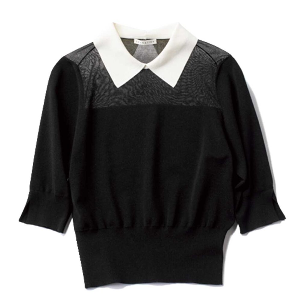 トレンドの衿付きニット。きちんと感がありつつも、透けたデコルテがモードな雰囲気をプラスします。ニット¥26,400(エストネーション/エストネーショングランフロント大阪店)
