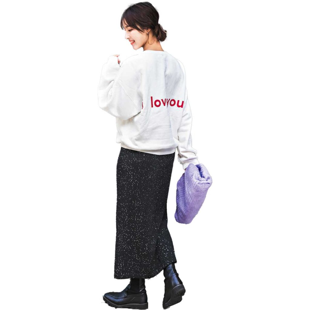 「ENCIRCLE」定番の白スウェットは背中に“i love you.„の文字入りで遊び心たっぷり。トレンドのラメスカートと合わせて、ドレッシー感をプラス。