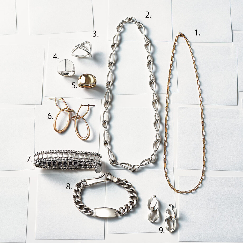 シンプルな着こなしをキリッと引き締めてくれる地金ジュエリーは、そのクールな佇まいでカッコいい知的な女性を印象付けます。重要な仕事の場面では、華奢なスキンジュエリーで可愛さを演出するよりも、強めのジュエリーで頼れる人に見せるのが正解。着けているだけで顔周りや手元に存在感を感じられ、自信をもたらしてくれるはず。1.ネックレス〈K18YG〉¥111,100(ポンテヴェキオ/ポンテヴェキオ 銀座並木通り本店)2.ネックレス〈SV925〉¥85,800(エル・エー・エイチ/ヴァンドームヤマダ)3.リング〈SV925〉¥22,000(スタージュエリー/スタージュエリー表参道ヒルズ店)4.リング(SV)¥48,400(ヒロタカ/ヒロタカ 表参道ヒルズ)5.リング〈SV925(YGコーティング)〉¥19,800(IRIS47/Hooves)6.ピアス〈SV(YGコーティング)×DIA〉¥34,100(4℃/エフ・ディ・シィ・プロダクツ)7.ブレスレット¥15,400(フィリップ オーディベール/デミルクス ビームス 新宿)8.ブレスレット〈SV〉¥52,800(エルナン エルデス/エスケーパーズオンライン)9.ピアス〈SV925〉¥27,500(スタージュエリー/スタージュエリー表参道ヒルズ店)