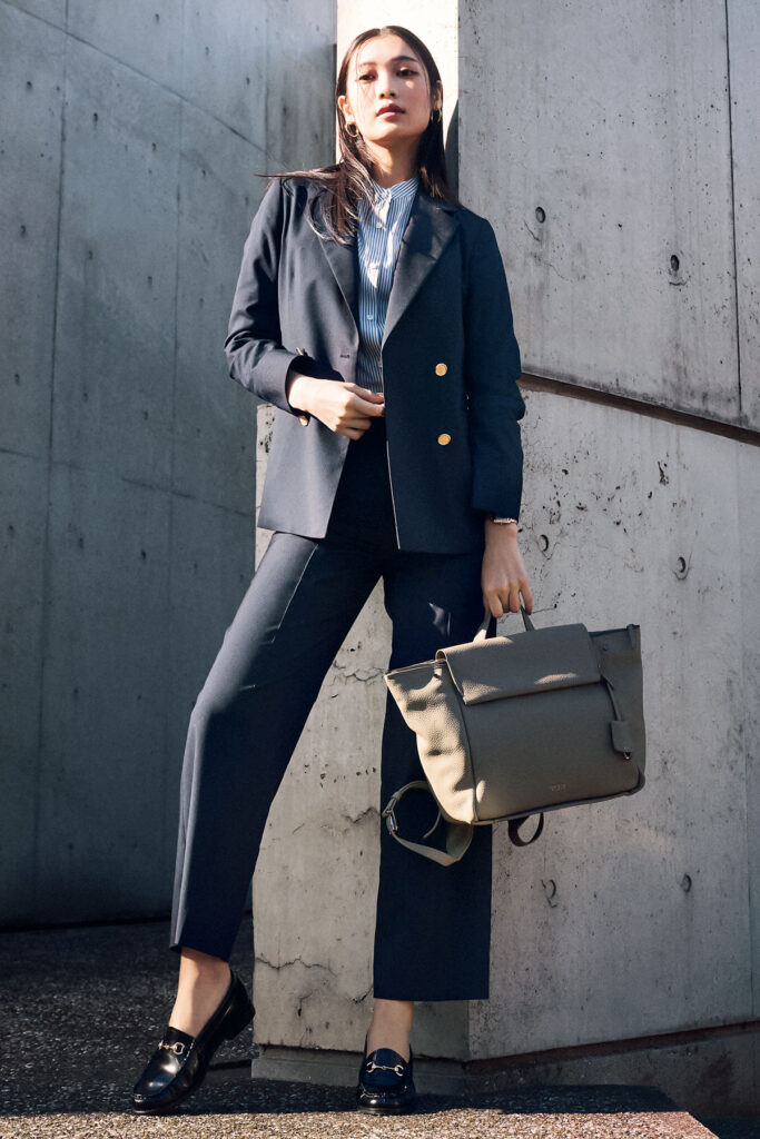 紺ブレやローファーのトラッドアイテムに頼れば、スーツ姿の男性が多い業界でも浮かないスタイルに。ジャケット¥19,800パンツ¥10,890(ともにオリヒカ/オリヒカ池袋東口店)ブラウス¥53,900(ebure/ebure GINZA SIX店)ベルト¥9,900(アンタイトル)バッグ¥121,000(トゥミ/トゥミ・カスタマーセンター)シューズ¥29,700(ダイアナ/ダイアナ 銀座本店)ピアス¥11,550〈ココシュニック オンキッチュ〉時計¥40,700(ともにココシュニック)