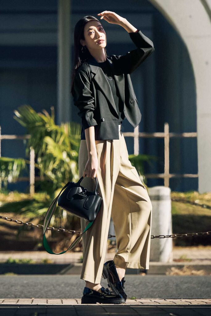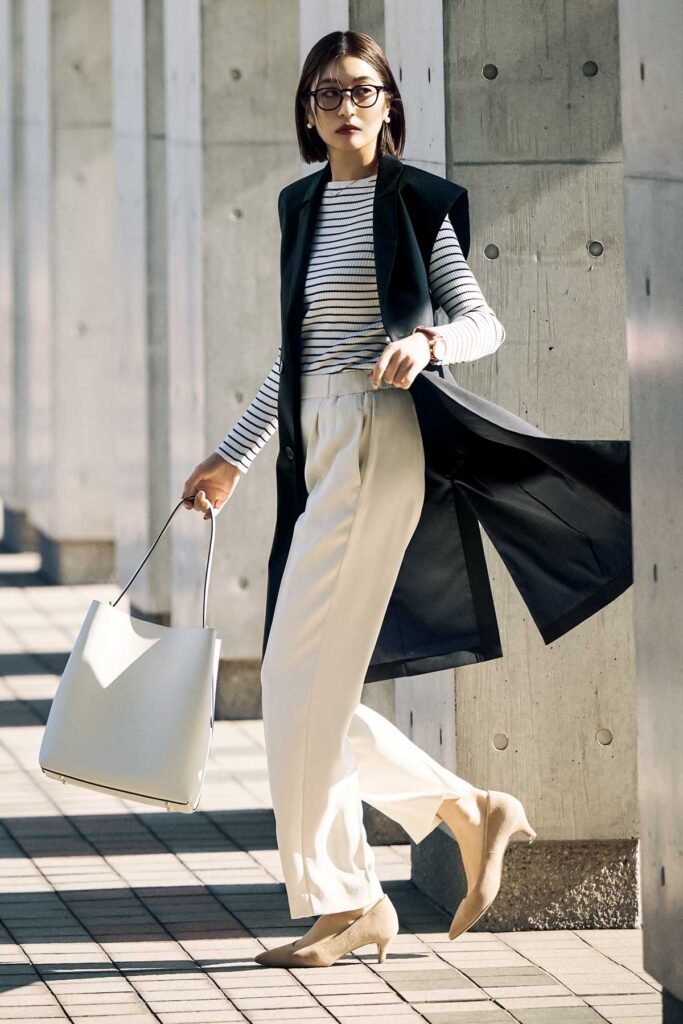 ジレ¥35,200(ルーニィ)ニット¥ 29,700(DES PRÉS)パンツ[セットアップ価格]¥17,000(PLST)バッグ¥36,300(ジャンニ・ノターロ・ペル・アルアバイル/アルアバイル)パンプス¥20,350(ピシェアバハウス/アバハウス インターナショナルオンラインストア)ピアス¥2,200(アネモネ/サンポークリエイト)ネックレス¥50,600(ココシュニック)メガネ¥44,000(アイヴァン/アイヴァン東京ギャラリー)時計¥22,990 (クルース/HIROB ルミネ新宿店)